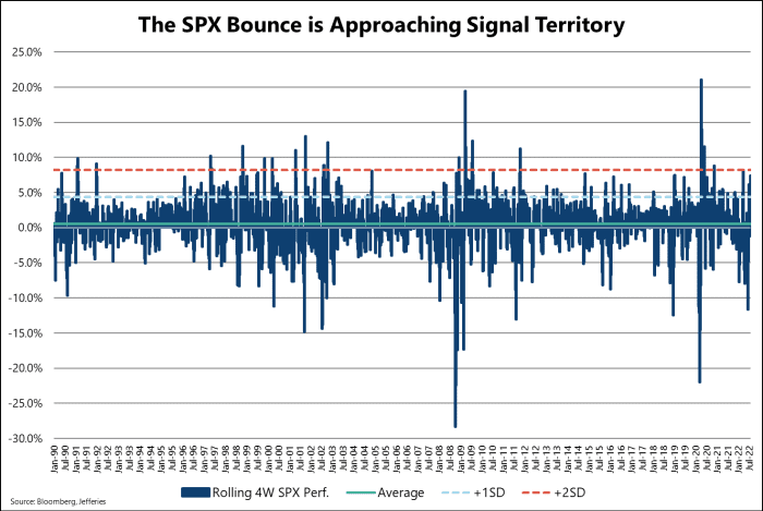 A rise of just more than 8% over four weeks would mark a two-standard deviation for S&P 500 rallies, they observed, based on data going back to 1990, which means the market won’t need “much more juice” to hit statistically significant territory.